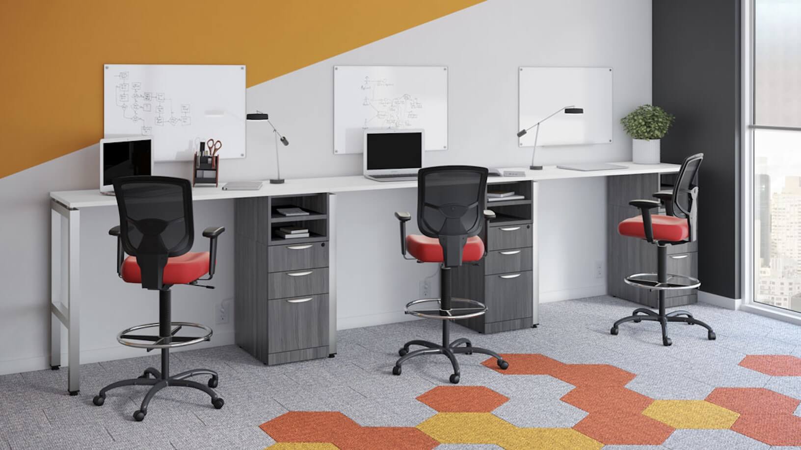 Common types of commercial-grade office furniture include: